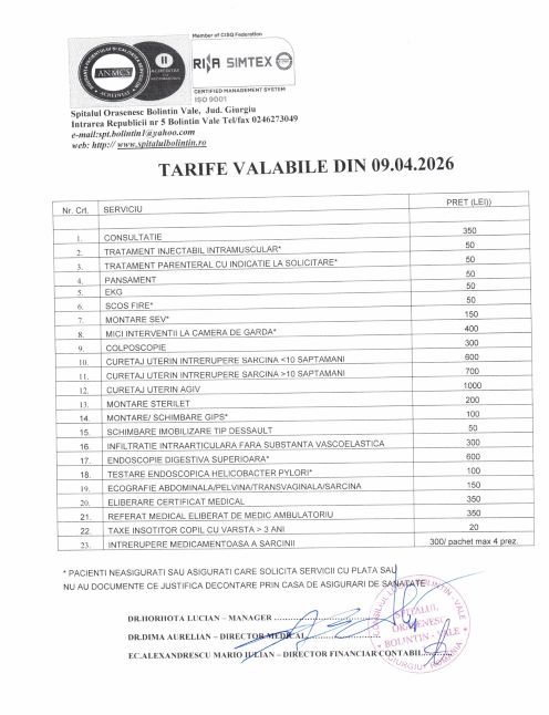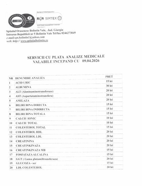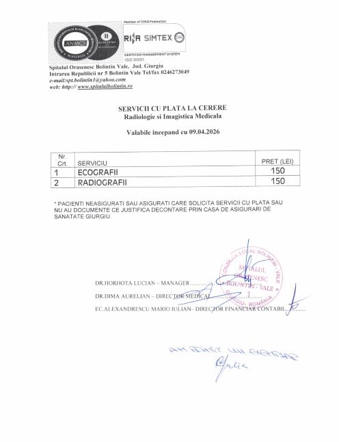 Tarife Spital Bolintin servicii medicale, analize laborator si Radiologie conventionala /Ecografii